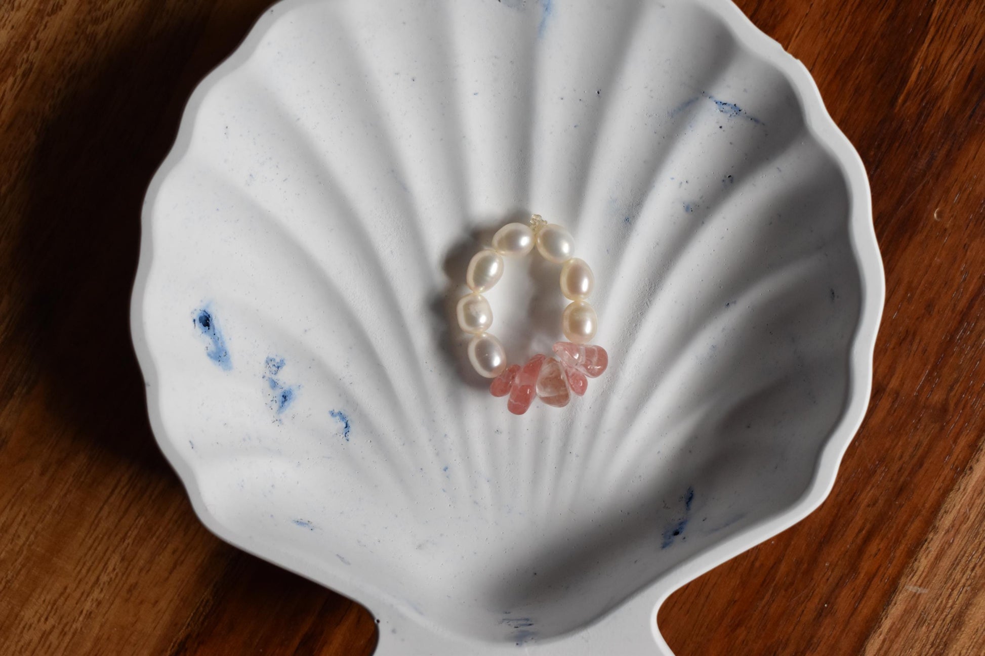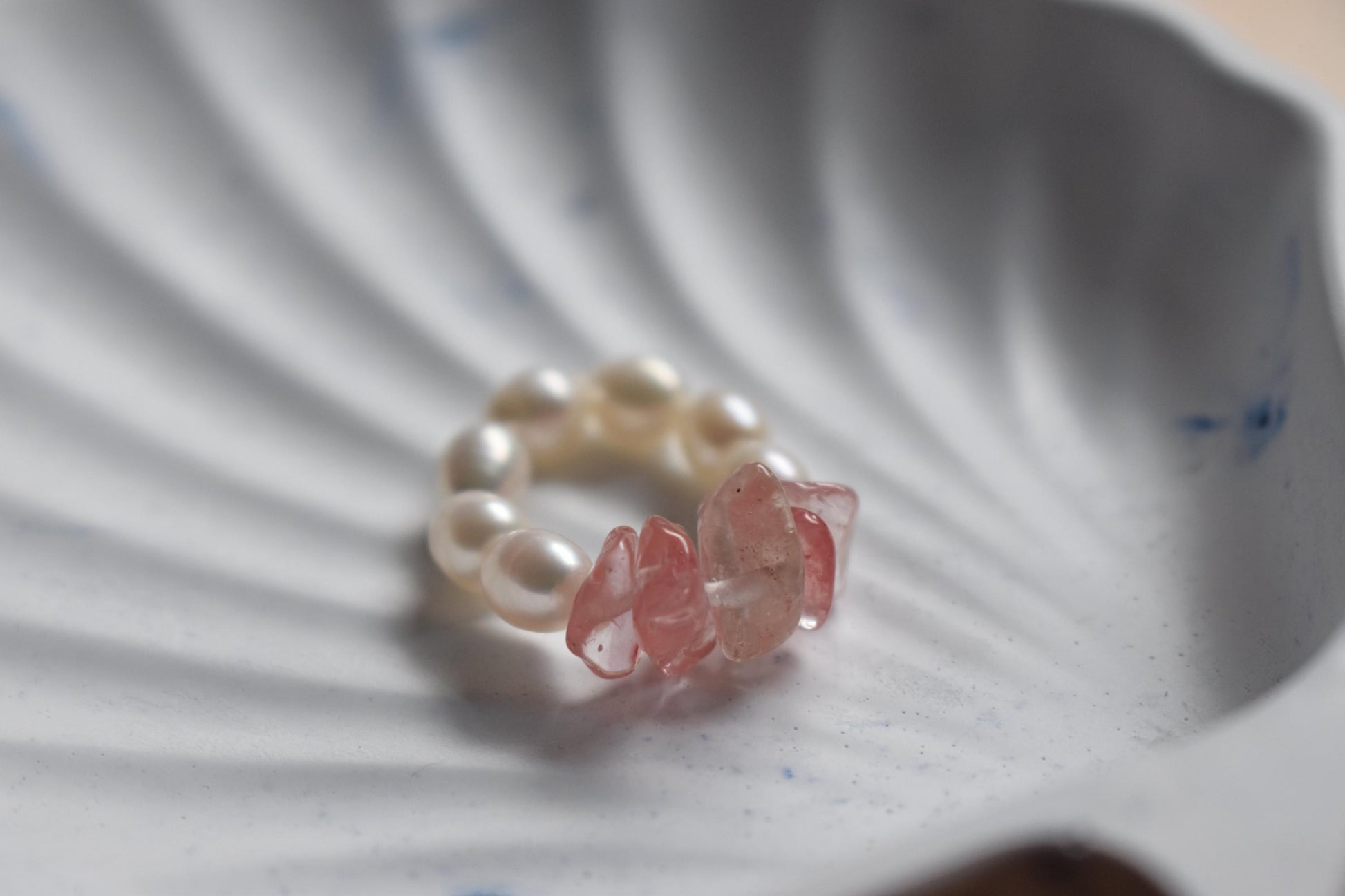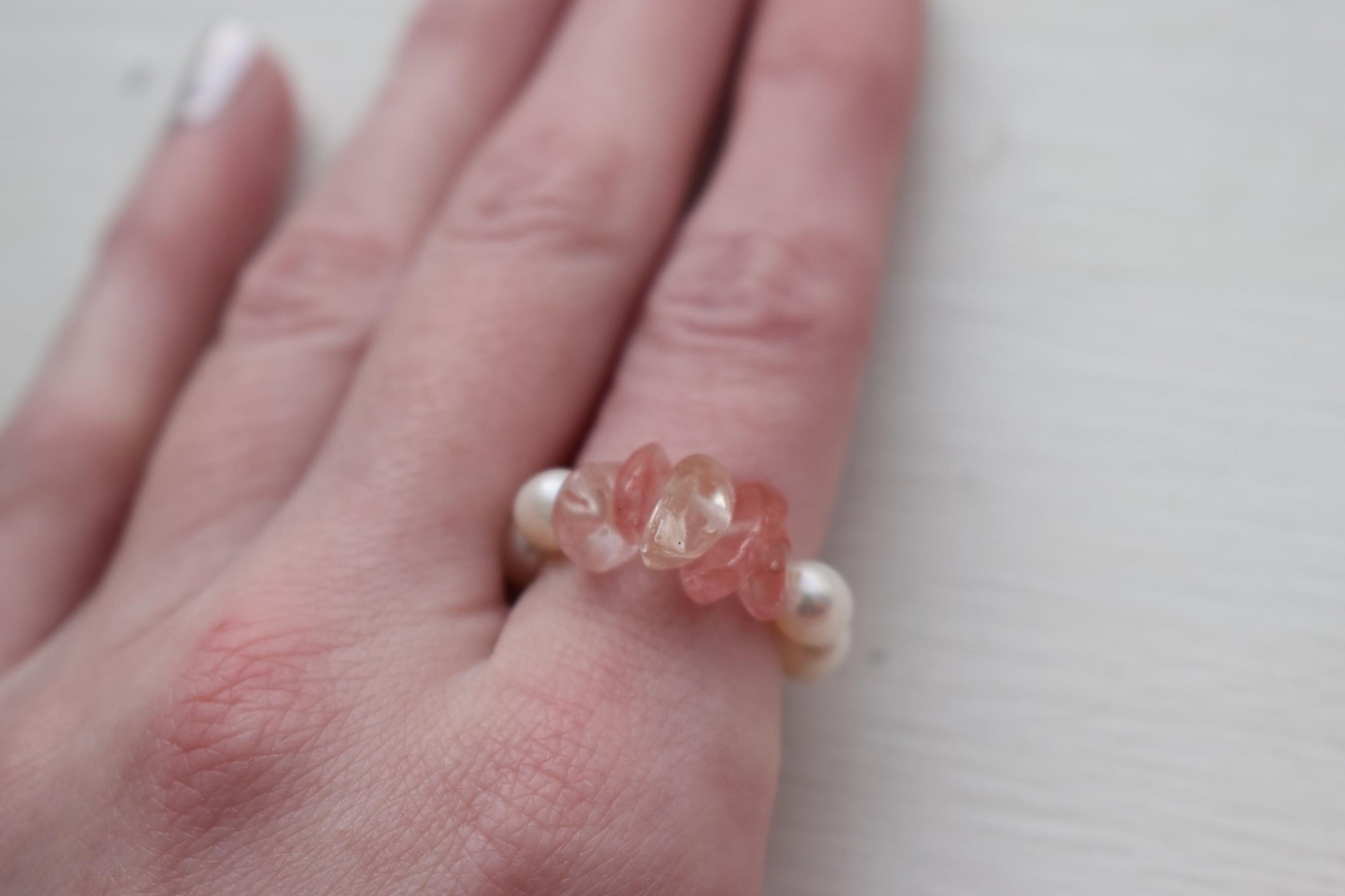 Delicate Freshwater Pearl & Cherry Quartz Stretch Ring - Handmade, Adjustable, Natural Gemstone Jewellery