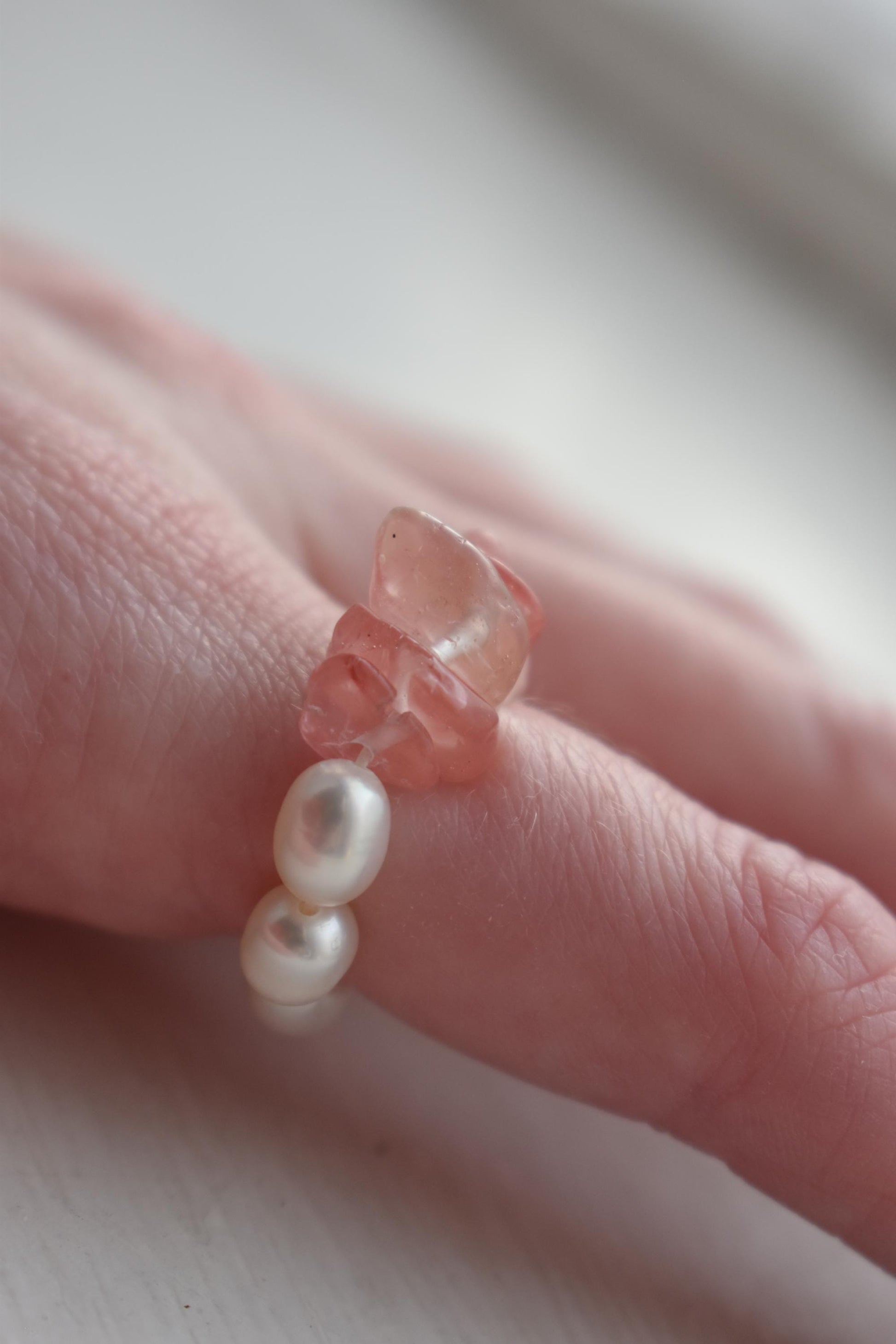Add a touch of elegance and positivity to your everyday look with this handmade freshwater pearl and cherry quartz stretch ring.