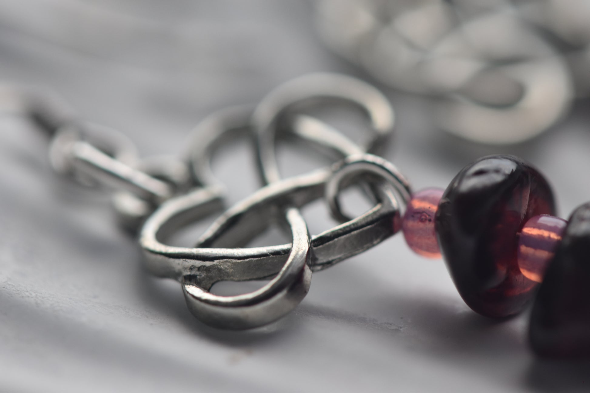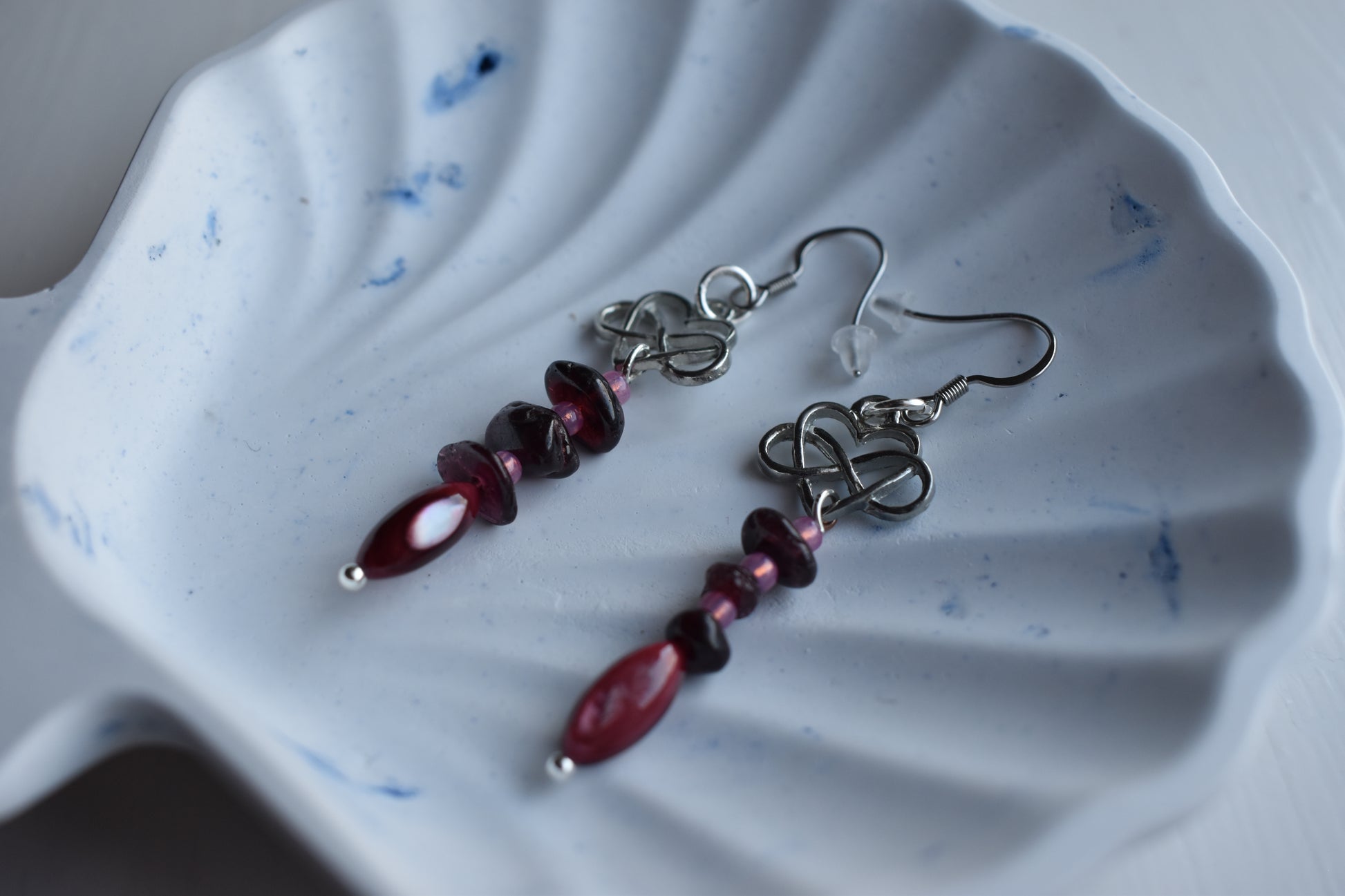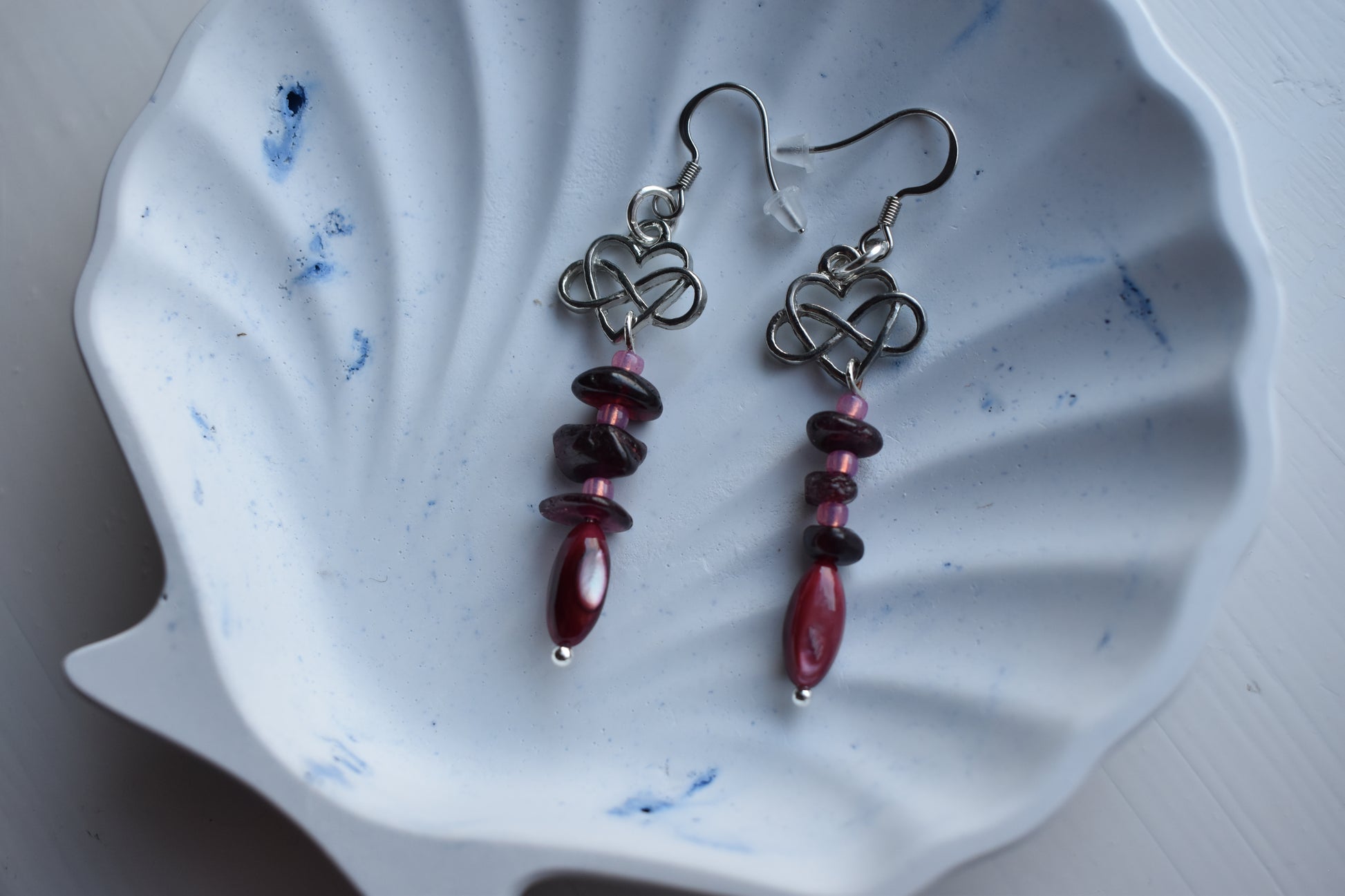 Silver-tone drop earrings featuring a layered arrangement of garnet gemstone beads, soft pink seed beads, and a deep rose oval shell bead, finished with a Celtic infinity heart charm at the top.