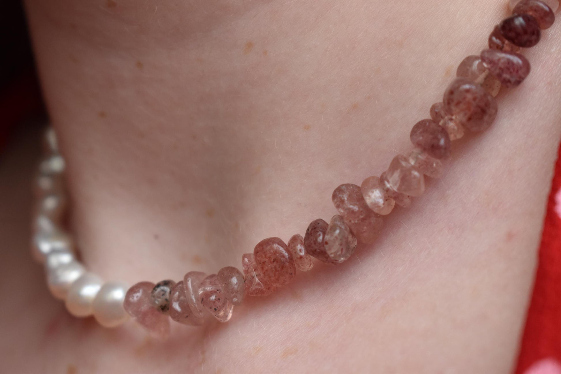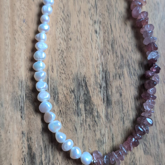 Strawberry Quartz & Freshwater Pearl Necklace - 15” Handmade Gemstone Jewellery